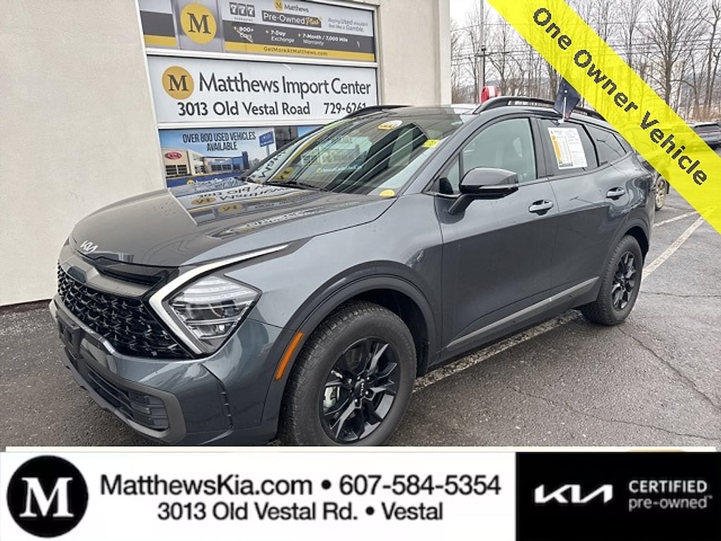 "Matthews Import Center promises each customer a thorough and confident 120-point inspection on our used inventory guaranteeing a relaxing and peace-of-mind experience. We are located behind Lowes in Vestal NY. Or call us at (607) 729 - 6261Matthews Import Center3013 Old Vestal RoadVestal NY 13850. Certified. Gravity Gray 2023 Kia X-Pro Prestige Sportage AWD 8-Speed Automatic I4Odometer is 15328 miles below market average! 23/28 City/Highway MPGKia Certified Pre-Owned Details: * Limited Warranty: 12 Month/12000 Mile (whichever comes first) ""Platinum Coverage""from certified purchase date * Warranty Deductible: $50 * Transferable Warranty * Powertrain Limited Warranty: 120 Month/100000 Mile (whichever comes first) from original in-service date * Includes Rental Car and Trip Interruption Reimbursement. 3 month Sirius trial subscription * 165 Point Inspection * Roadside Assistance * Vehicle History"