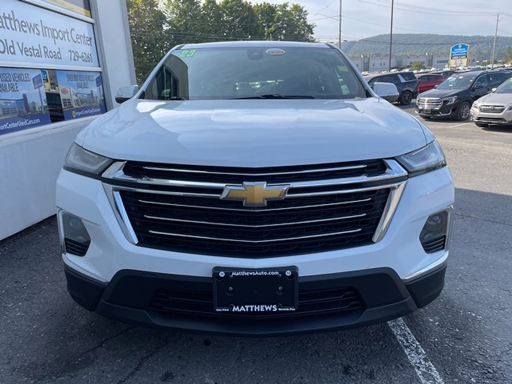 Matthews Import Center promises each customer a thorough and confident 120-point inspection on our used inventory guaranteeing a relaxing and peace-of-mind experience. We are located behind Lowes in Vestal NY. Or call us at (607) 729 - 6261Matthews Import Center3013 Old Vestal RoadVestal NY 13850. Summit White 2023 Chevrolet LT 1LT Traverse AWD 9-Speed Automatic 3.6L V6 SIDI VVT