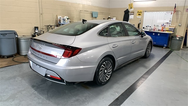 Curated Silver 2023 Hyundai Sonata Hybrid SEL FWD 6-Speed Automatic with Shiftronic I4 I4, 12 Speakers, 17" x 7.0J Aluminum Alloy Wheels, 4-Wheel Disc Brakes, ABS brakes, Air Conditioning, Alloy wheels, AM/FM radio: SiriusXM, Apple CarPlay & Android Auto, Auto High-beam Headlights, Automatic temperature control, Brake assist, Bumpers: body-color, Carpeted Floor Mats, Delay-off headlights, Driver door bin, Driver vanity mirror, Dual front impact airbags, Dual front side impact airbags, Electronic Stability Control, Emergency communication system: Blue Link Connected Car Service (3-year complimentary subscription), First Aid Kit, Four wheel independent suspension, Front anti-roll bar, Front Bucket Seats, Front Center Armrest, Front dual zone A/C, Front reading lights, Fully automatic headlights, Heated door mirrors, Heated Front Bucket Seats, Heated front seats, Illuminated entry, Knee airbag, Lane Departure Warning System, Leather steering wheel, Low tire pressure warning, Navigation System, Occupant sensing airbag, Option Group 01, Outside temperature display, Overhead airbag, Overhead console, Panic alarm, Passenger door bin, Passenger vanity mirror, Power door mirrors, Power driver seat, Power passenger seat, Power steering, Power windows, Premium Cloth Seating Surfaces, Radio data system, Radio: AM/FM/SiriusXM/MP3 w/Navigation, Rear air conditioning, Rear anti-roll bar, Rear side impact airbag, Rear window defroster, Remote keyless entry, Reversible Cargo Tray, Security system, Speed control, Speed-sensing steering, Speed-Sensitive Wipers, Split folding rear seat, Spoiler, Steering wheel mounted audio controls, Telescoping steering wheel, Tilt steering wheel, Traction control, Trip computer, Turn signal indicator mirrors, Variably intermittent wipers, Wheel Locks.