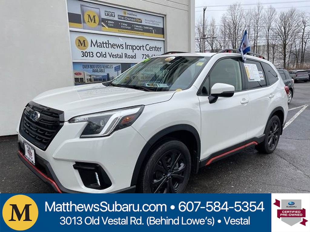 Certified. Crystal White Pearl 2024 Subaru Forester Sport AWD Lineartronic CVT 2.5L 4-Cylinder DOHC 16V26/33 City/Highway MPGSubaru Certified Pre-Owned Details: * 152 Point Inspection * Transferable Warranty * SiriusXM 3-Month trial subscription $500 Owner Loyalty coupon & 1 year trial subscription to STARLINK * Roadside Assistance * Powertrain Limited Warranty: 84 Month/100000 Mile (whichever comes first) from original in-service date * Warranty Deductible: $0 * Vehicle HistoryMatthews Import Center promises each customer a thorough and confident 120-point inspection on our used inventory guaranteeing a relaxing and peace-of-mind experience. We are located behind Lowes in Vestal NY. Or call us at (607) 729 - 6261 Matthews Import Center 3013 Old Vestal Road Vestal NY 13850.Odometer is 10013 miles below market average!